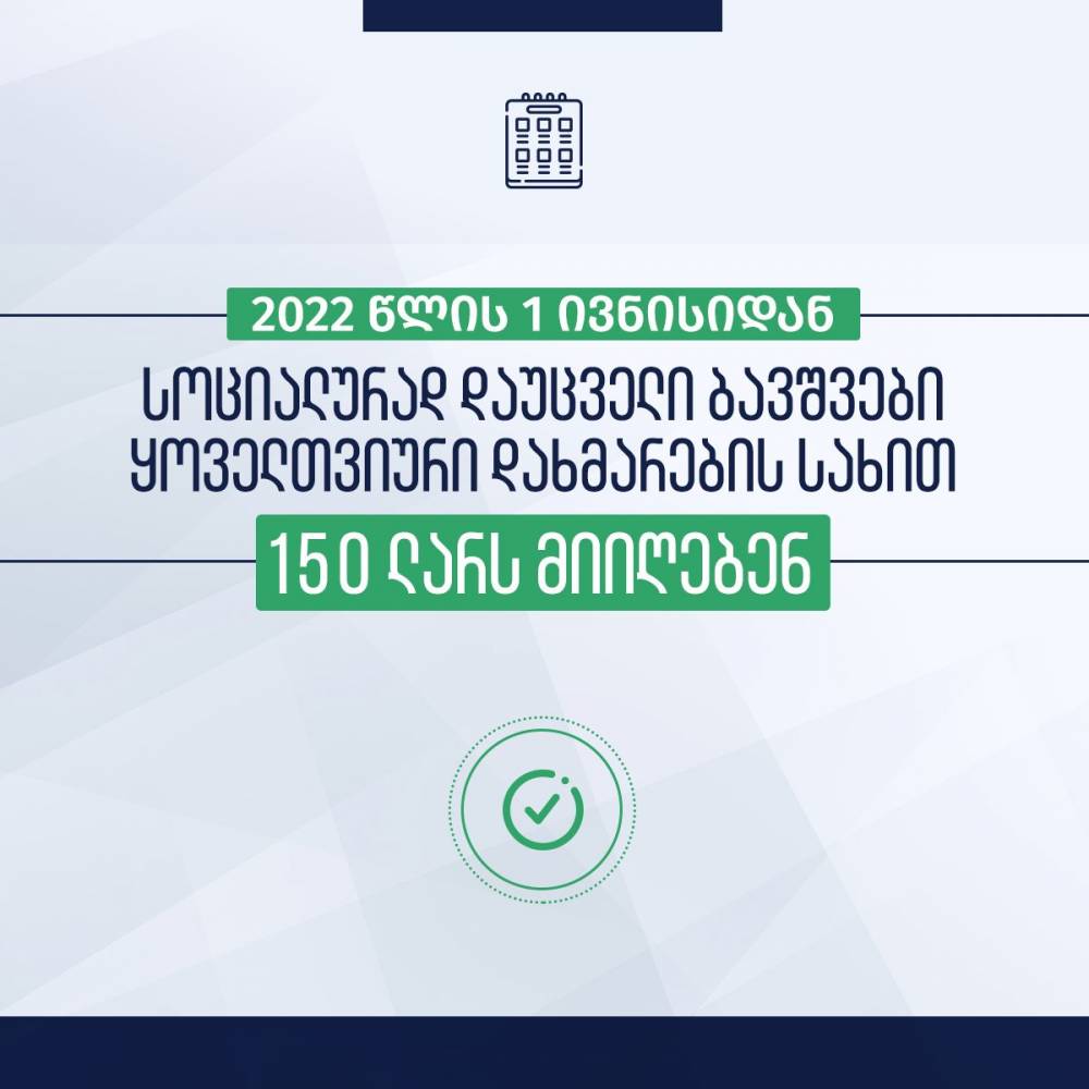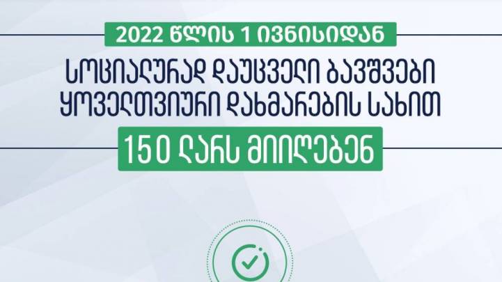 2022 წლის 1 ივნისიდან, სოციალურად დაუცველი ბავშვები ყოველთვიური დახმარების სახით 150 ლარს მიიღებენ.