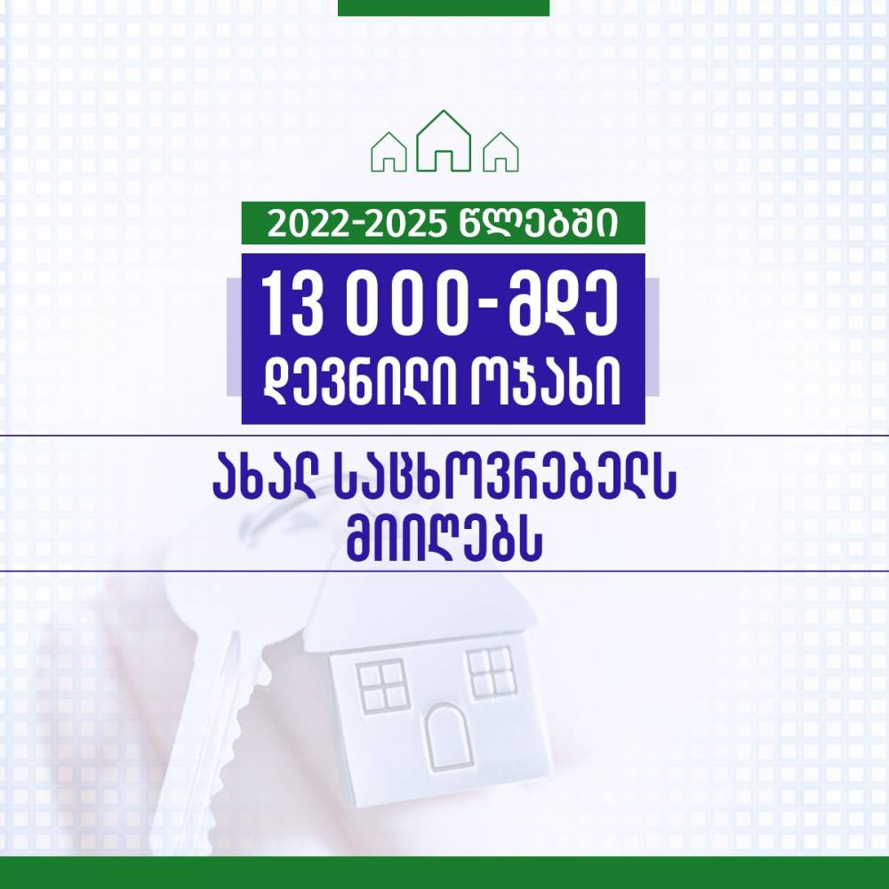 7000-მდე დევნილ ოჯახს, ახალაშენებულ კორპუსებში, თანამედროვე სტანდარტების, სრულად გარემონტებული ბინები გადაეცემათ. კორპუსების მშენებლობა 2022 წლის გაზაფხულზე თბილისში, რუსთავში, ქუთაისში, ზუგდიდსა და ბორჯომში დაიწყება და ეტაპობრივად დასრულდება. ამ ეტაპზე, ქუთაისში დასრულების ფაზაშია 700 ბინის მშენებლობა, რომლებიც ოჯახებს შემოდგომაზე გადაეცემათ. პროგრამის ბიუჯეტი, დაახლოებით 700 000 000 ლარია.