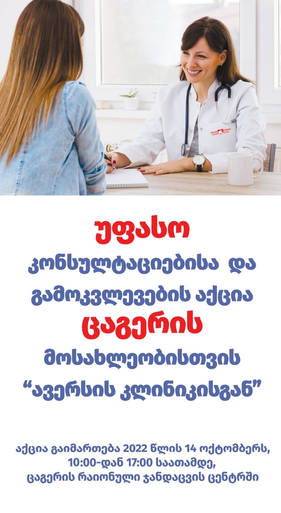 14 ოქტომბერს ცაგერის რეგიონული ჯანდაცვის ცენტრში ჩატარდება უფასო სამედიცინო კვლევების აქცია ცაგერის მოსახლეობისთვის " ავერსის" კლინიკისგან.