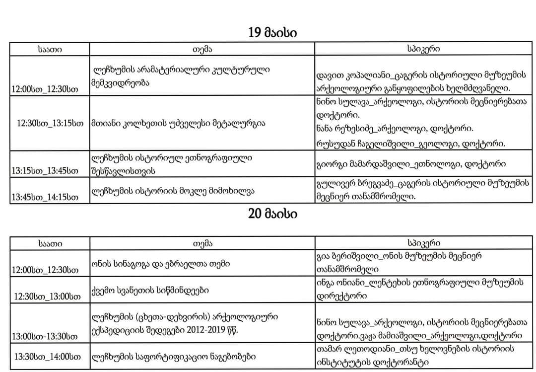 19-20 მაისს ცაგერის ისტორიულ მუზეუმში გაიმართება რეგიონული კონფერენცია ,,მთიანი კოლხეთის ისტორიული წარსულიდან" . თემები ძალიან საინტერესო და ინფორმაციულია.