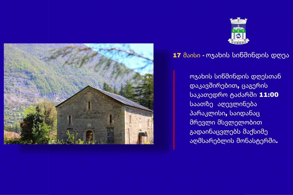ხვალ, 17 მაისს, ოჯახის სიწმინდის დღესთან დაკავშირებით, ცაგერის ღვთისმშობლის მიძინების სახელობის საკათედრო ტაძარში აღევლინება პარაკლისი, საიდანაც მრევლი მსვლელობით გადაინაცვლებს მაქსიმე აღმსარებლის სახელობის მონასტერში.