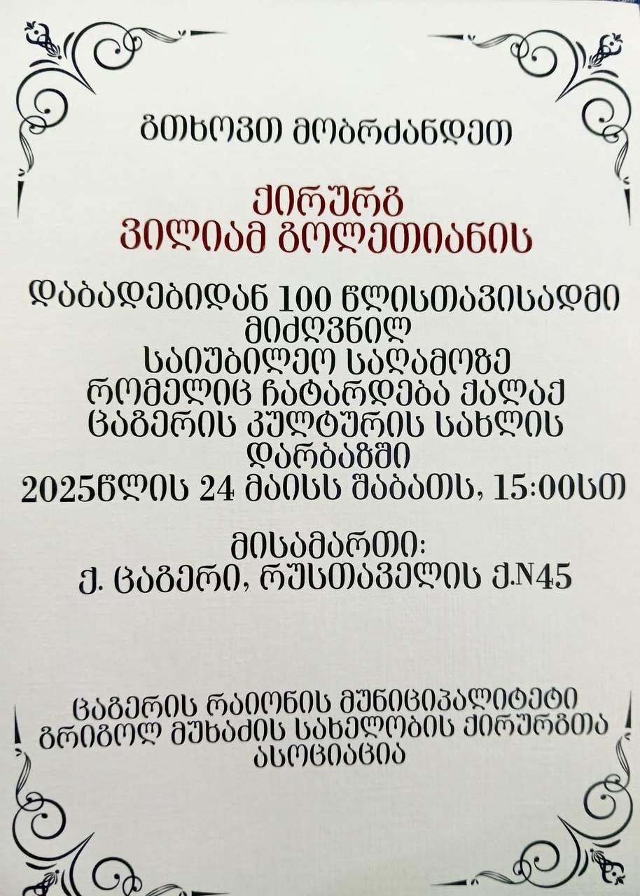 24 მაისს ცაგერის კულტურის ცენტრში დამსახურებული ექიმის,ვილიამ გოლეთიანის ხსოვნის საღამო გაიმართება.