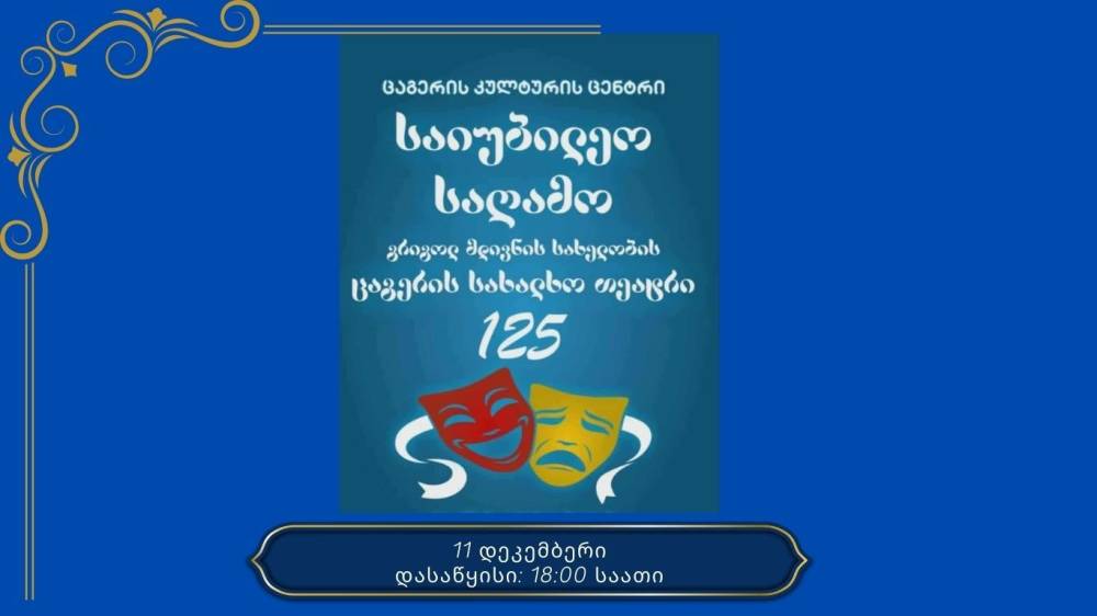 11 დეკემბერს ცაგერის კულტურის ცენტრში გრიგოლ მდივნის სახელობის სახალხო თეატრის 125 წლის საიუბილეო საღამო გაიმართება.