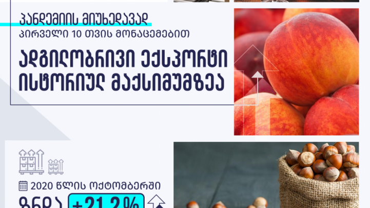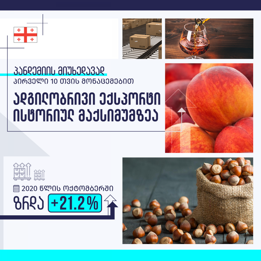 კორონავირუსის პანდემიის და გლობალური ეკონომიკური კრიზისის მიუხედავად, საქართველოს ეკონომიკის გაჯანსაღება წარმატებულად მიმდინარეობს - დაფიქსირდა ადგილობრივი ექსპორტის ზრდა, ამასთან 2020 წლის იანვარ-ოქტომბერში ადგილობრივი ექსპორტის მაჩვენებელი ისტორიულ მაქსიმუმზეა.